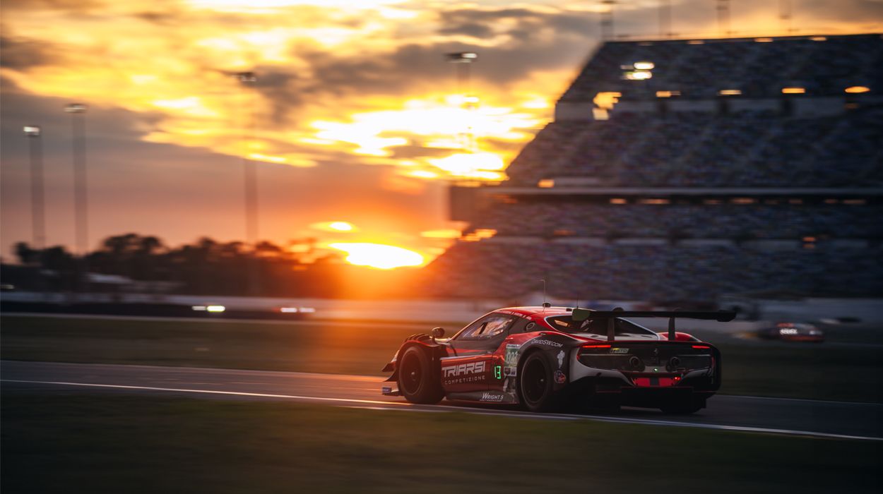 The Triarsi Competizione 296 GT3, racing in the GTD class, blasts into the sunset at Daytona